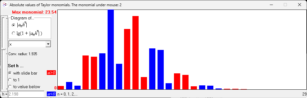 which graphs a diagram of the values of the Taylor monomials |anhn| allowing to observe the change of the profile for various h controlled by the slide bar at the left.