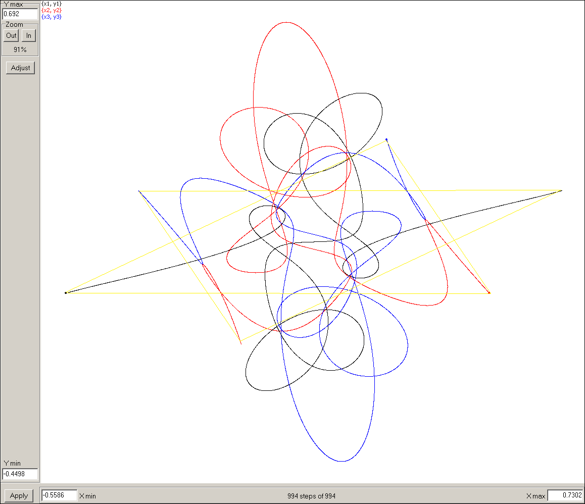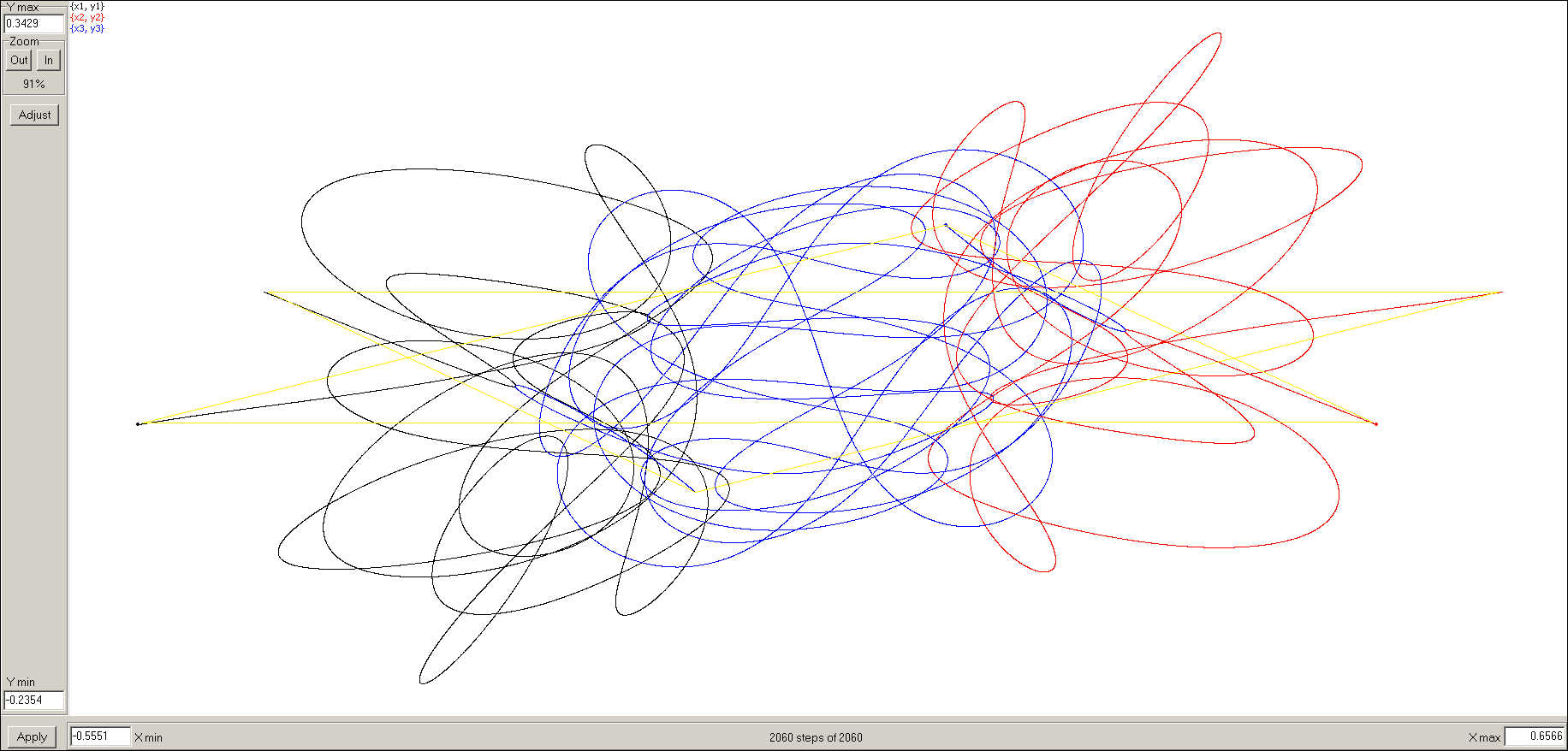 3) When the integration reaches the termination point (the period), the program displays the message. As you click OK, the program opens the Graph window displaying the entire trajectory. You may wish to Play it as a real time animation during certain time (by default the duration is 25 s). Depending on the complexity of the curve, it may require duration something like 60-80 seconds. Click Play button and enjoy the show. Then repeat everything from step 2 for another sample.