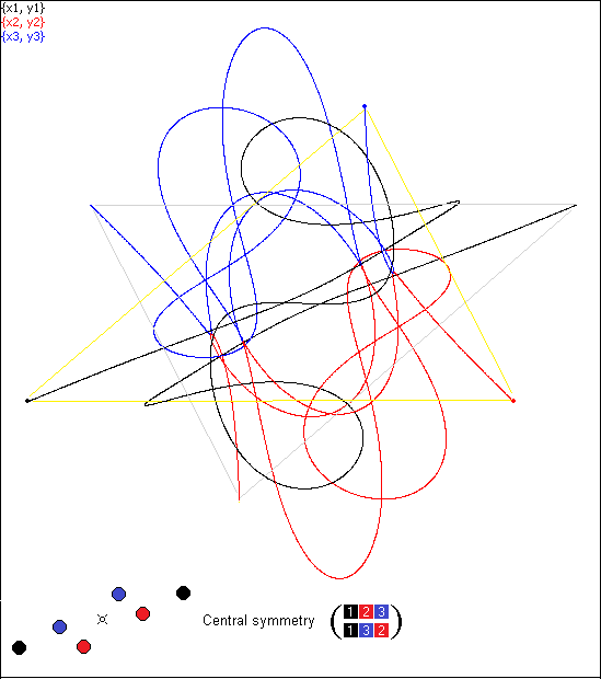 6. In the remaining 9 orbits the edges of the triangles in pairs are not parallel as both triangles are in the relation of reflection, i.e. the two respective parts of orbits are symmetric over some line of symmetry which, however, is not necessarily the line of syzygy. Specifically...