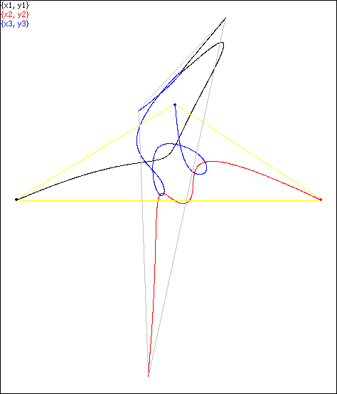 ABC. Their trajectories, however, may not necessarily lead to the corresponding vertices A′, B′, C′ of the A′B′C′, as some of the simulations below demonstrate. Among the data collected by the special research program, there are the permutations (αβγ), where the identity permutation is denoted  Id = (123). In the case of the Id  permutation, the trajectories of the bodies #1, #2, #3 lead from the vertices A, B, C to the corresponding vertices A′, B′, C′ (no matter whether A′B′C′ is a reflection of ABC or not).