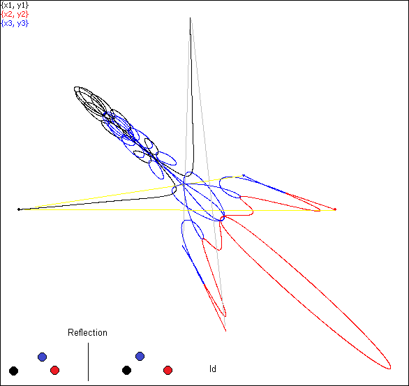 In these 9 cases of congruence with reflection, the two triangles are in the relation of reflection over a certain line of symmetry (in yellow), and also the entire trajectories have the same line of symmetry. In some of the following 9 cases with reflection, a non-Id permutation takes place, meaning that the trajectory of a body #i (1 ≤ i ≤3) starting at a vertex X reaches a vertex Y ≠ X,  X, Y {A, B, C}. If this is the case, the geometrically respective vertices would have different colors in accordance with the moving body color.