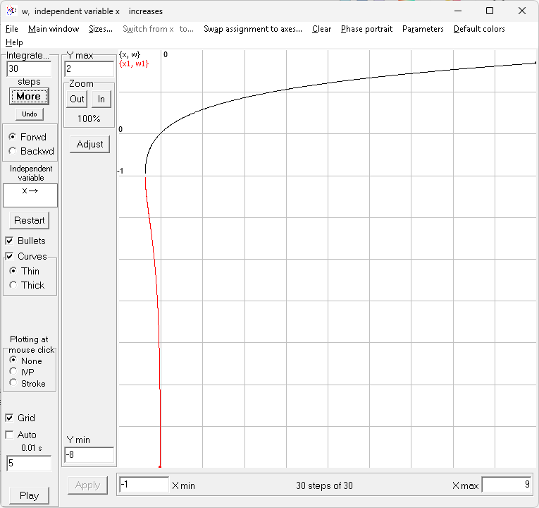 Run the script wStopped.scr (and check the box Grid). Observe, that while the red W1 branch evolved completely, the black W0 branch hardly reached the point x = 0. Play it again and pay attention how the red bullet of W1 moves much faster than the black bullet of W0. The bullet of W1 moves down quickly toward big (absolute) values of W1 approaching the asymptote x=0 closer and closer. As the result, the integration step (the same for both variables!) steeply approaches zero so that the integration process stops near x=0.
